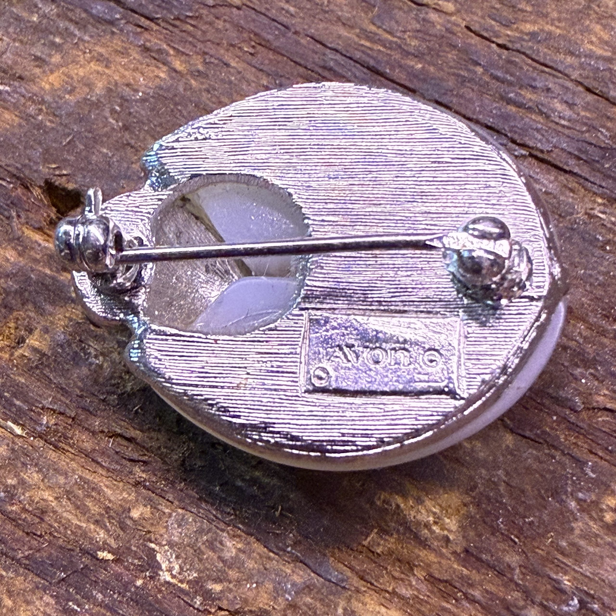 Vintage signed Avon ladybug brooch made with a white frosted lucite body and set in silver-tone metal with clear rhinestone accents.