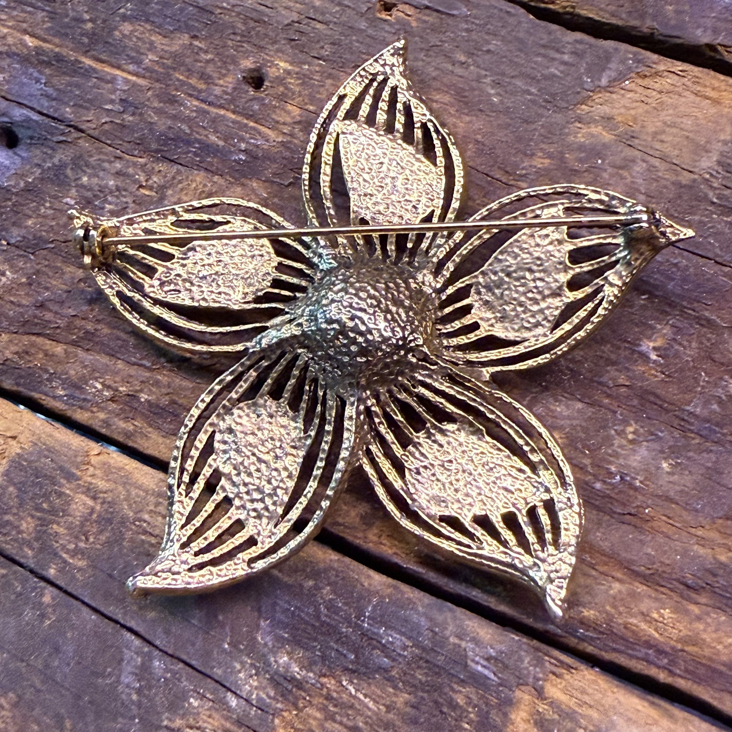 Vintage 2.5″ large flower brooch with gold-tone metal and multi-colored rhinestones.